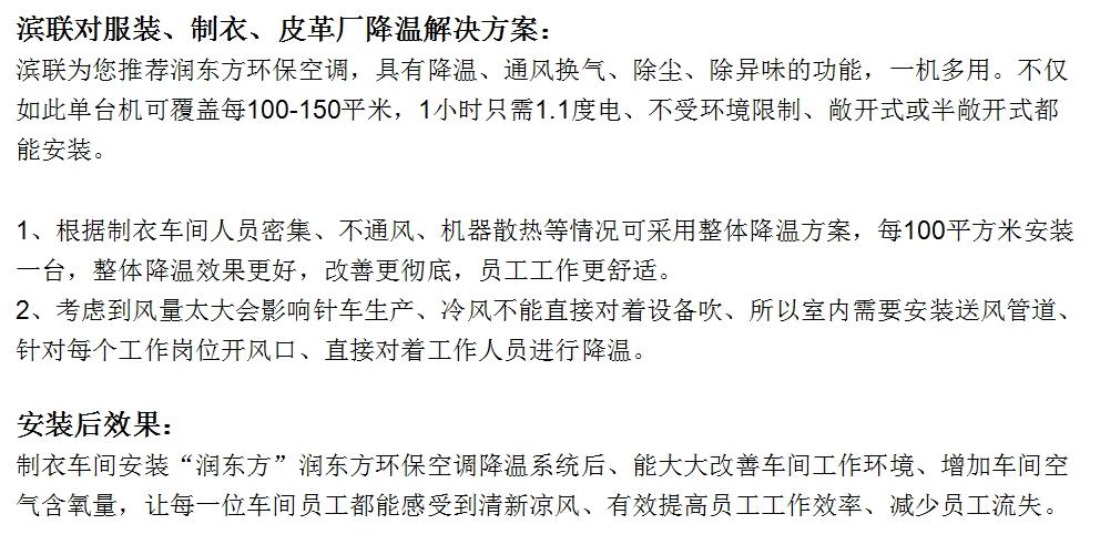 结论 滨联环保空调总费用每年比传统空调节省25200元而且综合效果比传统空调好。 滨联环保空调每年总费用比同等面积所需传统风机节省5040元,且效果远比传统风机卓越。 |