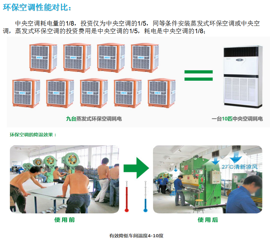 按150m2面积安装适当管道,每天运行10小时,以12个月每度电按1元计算,如此计算,投资安装滨联蒸发式冷空机的成本不到一年可全部赚回。 | |||