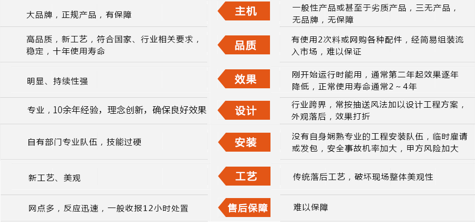 | 2、高品质,新工艺,符合国家、行业相关要求, 稳定,十年使用寿命; | 品质 | 有使用回收料或2次料或网购各种配件,经简易组装流入市场,难以保证; |