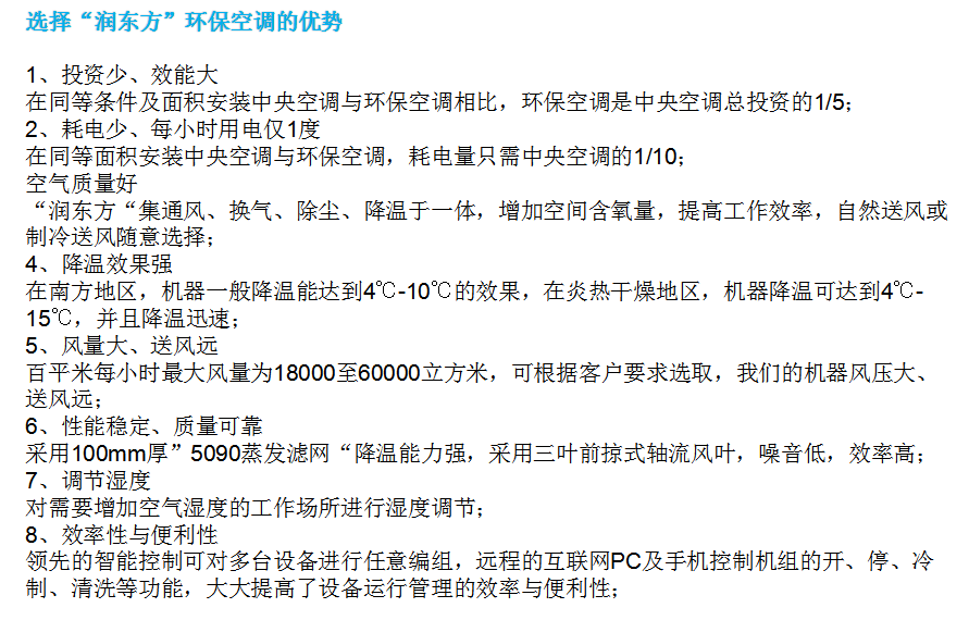 结论 滨联环保空调总费用每年比传统空调节省25200元而且综合效果比传统空调好。 滨联环保空调每年总费用比同等面积所需传统风机节省5040元,且效果远比传统风机卓越。 |